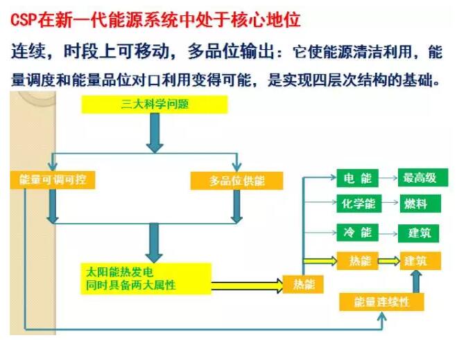 国家太阳能光热联盟常务副理事长王志峰和浙江大学博士生导师肖刚合作完成的《太阳能热发电在新一代能源系统中的定位》报告指出:要定位好太阳能热发电的作用,首先要定位好可再生能源在新一代能源系统中的核心地位。因为电网面临波动的可再生能源电力这一新的挑战,当大规模新能源电力为电力输送的分配源端时,需要灵活高效地将可再生能源电力并网和传输融入到电力发展中。新的形势要求电网能根据用电峰值不同,在不同可再生能源交替使用的情况下,在不同时间段可以满足用户侧的使用需求,不会因为某一可再生资源的供给不稳定而影响用户侧的使用。如何调节供给侧和需求侧在不同时间的需求矛盾呢?太阳能热发电技术及其储热技术不仅可以保证供电的稳定性、平滑性,还能降低发电成本,是保证新一代能源系统运作顺畅的最优选择。