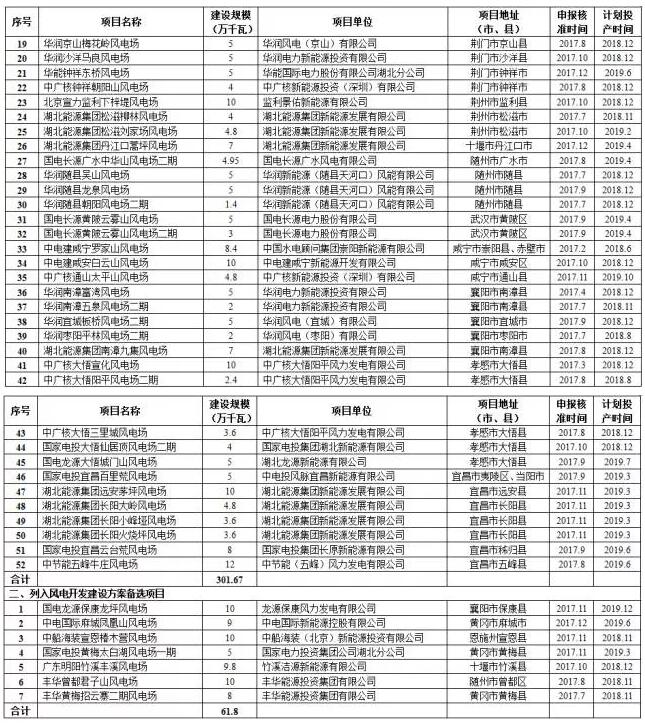 一、根据各市、州报送的2017年风电开发建设方案,经相关企业再次确认,在统筹考虑全省风电开发建设情况、资源状况、电力市场消纳情况、项目前期工作推进情况,以及国家电价政策调整等因素的基础上,确定将湖北能源集团鹤峰走马风电场等52个项目、总装机容量301.67万千瓦列入2017年湖北省风电开发建设方案,将国电龙源保康龙坪风电场等7个项目、总装机容量61.8万千瓦作为2017年湖北省风电开发建设方案备选项目。