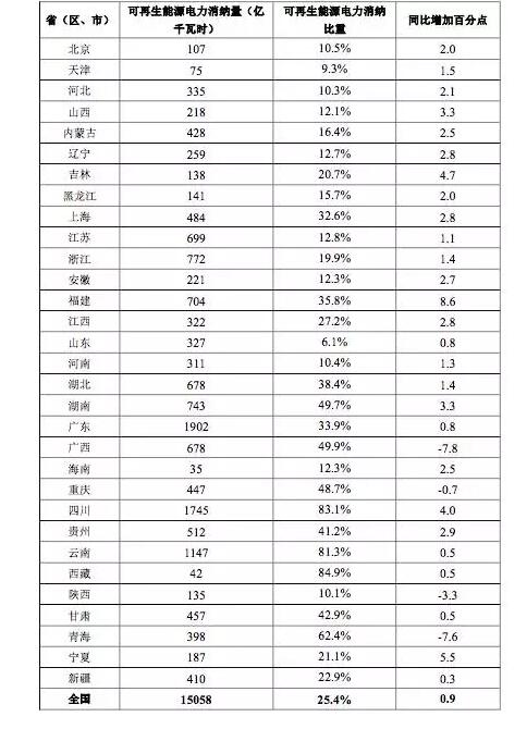 2、各省(区、市)可再生能源电量消纳占比,等于各省(区、市)可再生能源消纳量除以本地区全社会用电量。