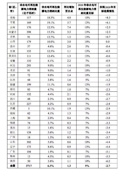 宁夏。2016年,全部可再生能源电力消纳量大幅提高,达到187亿千瓦时,占本省全社会用电量的比重为21.1%,同比上升5.5个百分点;非水电可再生能源电力消纳量为169亿千瓦时,占本省全社会用电量的比重为19.1%,同比上升5.7个百分点。风电和光伏发电均未达到最低保障收购年利用小时数要求,偏差分别为297小时和231小时。