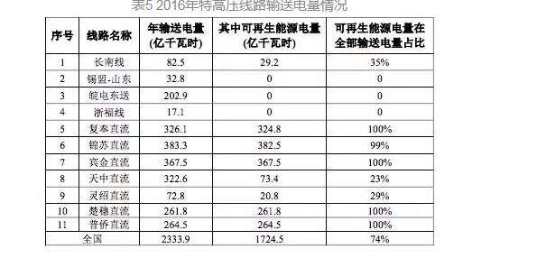 2016年,11条特高压线路输送电量2334亿千瓦时,其中输送可再生能源电量1725亿千瓦时,占全部输送电量的74%。国家电网公司覆盖区的9条特高压线路输送电量1808亿千瓦时,其中可再生能源电量1198亿千瓦时,占全部输送电量的66%;南方电网公司覆盖区的2条特高压线路输送电量526亿千瓦时,全部为可再生能源电量。