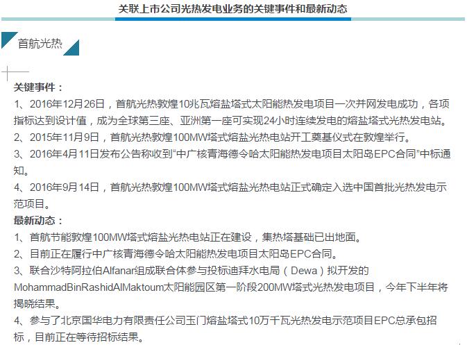 一个50MW级商业化电站的总投资高达15~20亿元,光热发电的资金密集型属性为行业玩家设置了较高的进入门槛。上市公司依托其上市平台在资金募集方面具有先天优势,在光热项目开发方面易于扫清资金障碍,由此也可获得较大的竞争优势。