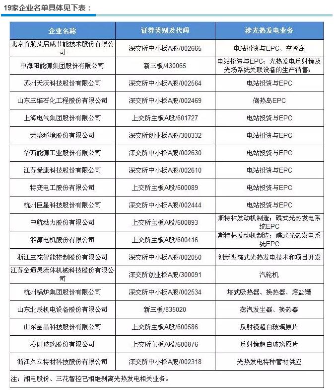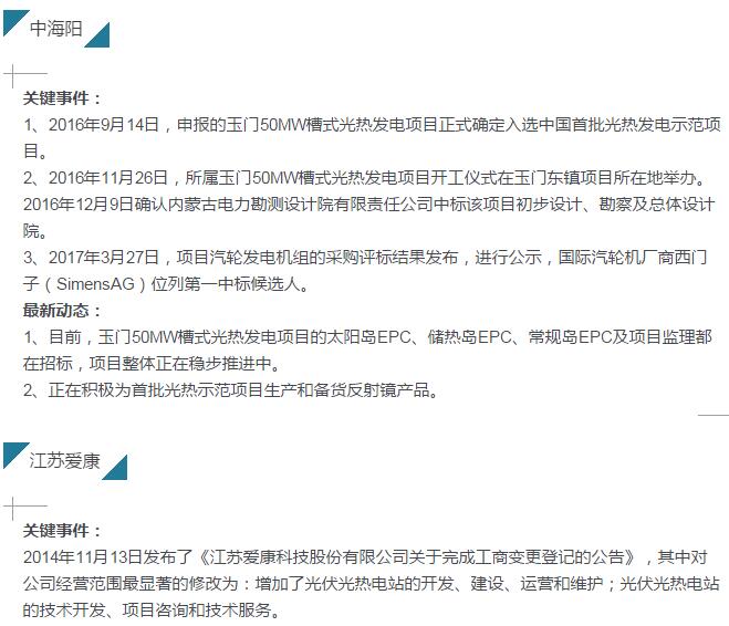 据统计,截至2017年4月,我国涉及光热发电业务的相关上市公司已达19家(包括此前涉及但现已退出的个别公司)。其中,全国工商联新能源商会执行会长单位爱康集团,常务副会长单位中海阳、首航光热等多家企业赫然在列。