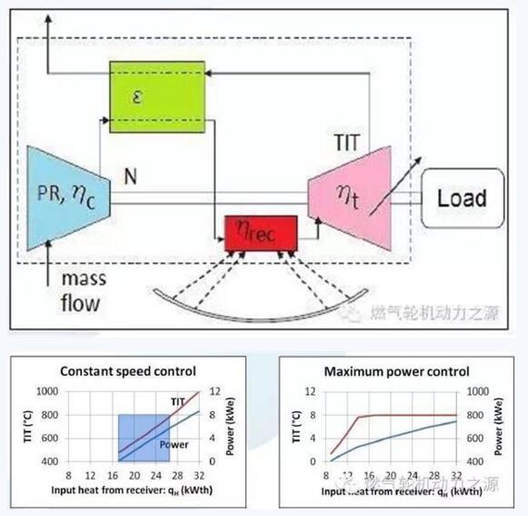 示范机组的出力为3-10kW。如果需要更大出力,可通过模块化组合实现。如果在偏远地区的学校和住房,通常一个模块就足够。每个模 块有其独立的微型燃机,安装在带有双轴太阳追踪系统的支柱上。和普通微型燃机通过燃料燃烧增加工质温度不同,CSP上的微型燃机的空气是被太阳能加热的,透平进口温度目标为800~900℃。该温度和重型燃气轮机相比无疑是低的,重型燃机透平进口温度一般为 1400℃左右。微型燃机没有叶片冷却,因此材料收到限制,微型燃机的透平进口温度甚至可达1100℃,但是太阳能接收器receiver的材 料是有限制的。