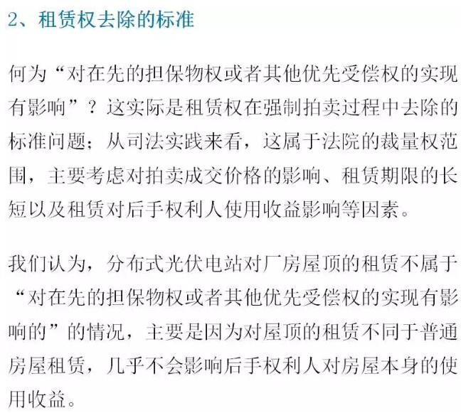 分布式光伏电站在长达25年的生命周期内,其租赁的厂房业主难免应发生经营困难甚至陷入被强制执行厂房的境地。最高人民法院《关于人民法院民事执行中拍卖、变卖财产的规定》(法释[2004]16号)第三十一条规定:“拍卖财产上原有的租赁权及其他用益物权,不因拍卖而消灭,但该权利继续存在于拍卖财产上,对在先的担保物权或者其他优先受偿权的实现有影响的,人民法院应当依法将其除去后进行拍卖。”在强制执行过程中租赁权是否去除,对分布式光伏电站影响甚大。