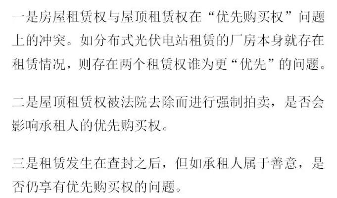 关于第一个问题,理论和司法实践中仍存在争议。我们认为,为减少优先购买权的争议,分布式光伏电站可在屋顶租赁协议或合同能源管理协议中当中明确约定在一定条件下光伏电站对厂房的优先购买权,并约定优先购买权无法行使情况下的赔偿机制。