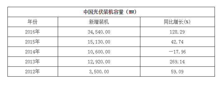 截至2016年底,中国光伏发电新增装机34.54吉瓦,累计装机77.42吉瓦,新增和累计装机容量均列全球第一。