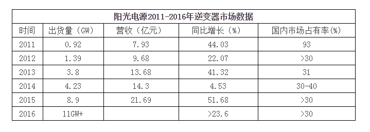 2015年,阳光电源光伏逆变器全球出货达8.9GW,其中国内出货7.7322GW,较2014年增长103.02%;国外出货1.1745GW,较2014年增长175.64%。超越连续多年排名全球第一的SMA,从“中国第一”升级为“ 全球第一”。