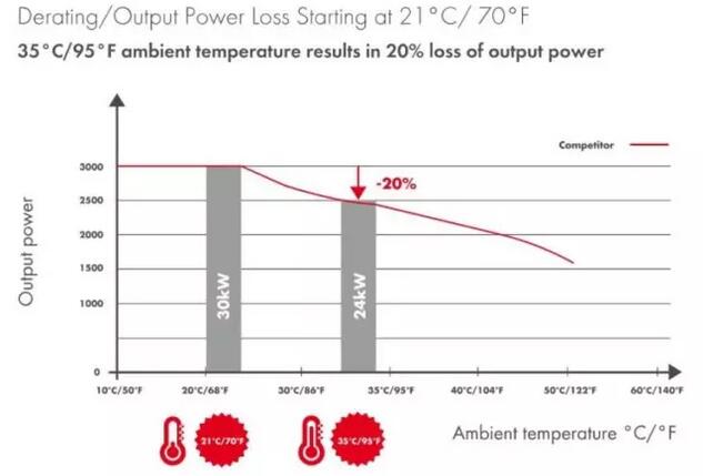 廉价的逆变器经常会在环境温度21℃时就有输出功率损失,它们无法处理光照下功率损失问题。