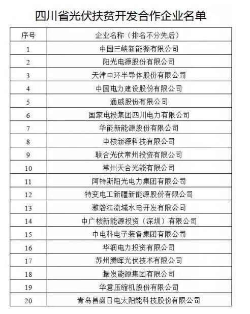 今年1月4日,四川省能源局在省发展改革委门户网站上发布了《四川省光伏扶贫开发企业优选公告》,在企业自愿报名基础上,组织专家对申报企业进行优选评估。评估工作坚持公平、公正原则,主要从企业规模、技术实力、企业业绩和信誉等方面进行综合评分。根据专家评估结果,现将四川省光伏扶贫开发合作企业名单(详见附件)予以公示。
