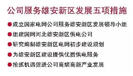 二是组建国网河北雄安新区供电公司。先期成立雄安新区供电公司筹备组,下设规划组、建设组、供电服务组、综合事务组,从国家电网公司全系统抽调精兵强将,配强专业力量,负责具体做好新区电网规划建设、安全生产、供电服务等方面工作。
