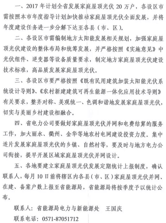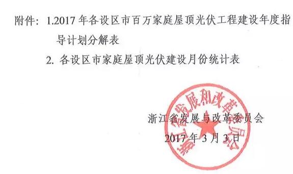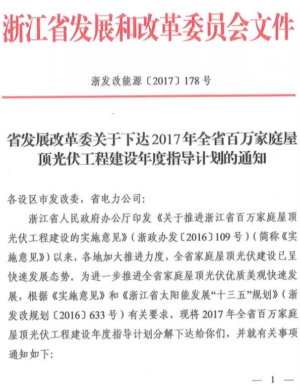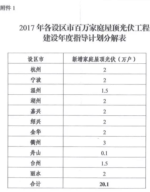 浙江省发改委于近日发布了《关于下达2017年全省百万家庭屋顶光伏工程建设年度指导计划的通知》(浙发改能源〔2017〕178号),对全省屋顶光伏建设任务作了分解。根据《通知》,2017年全省新增家庭屋顶光伏户数20.1万户。