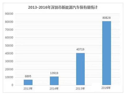 根据深圳交警发布数据,2016年深圳市新能源汽车保有量达80828辆,比2015年增加40109辆,增长98.50%。
