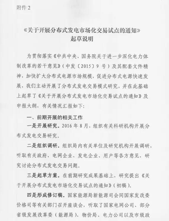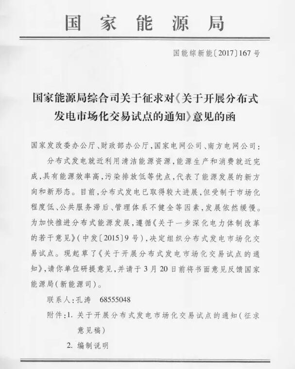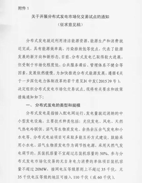 近日,国家能源局综合司近日下发关于征求对《关于开展分布式发电市场化交易试点的通知》意见的函。