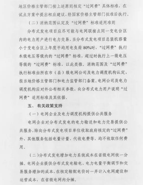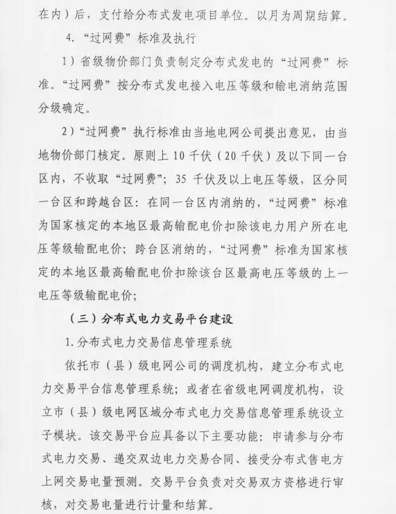 4、过网费标准:电力用户(含微电网内部)自发自用及在10(20)千伏电压等级且同一变电台区内消纳,免收过网费;35-100千伏接入电网且在同一变电台区内消纳,过网费标准为国家核定的本地区最高输配电价扣除改电力用户所在电压等级输配电价。
