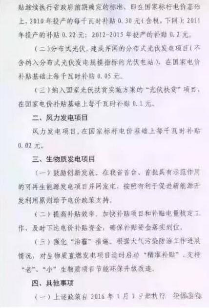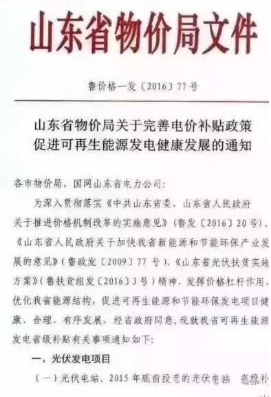 例如:山东省物价局下发《山东省物价局关于完善电价补贴政策促进可再生能源发电健康发展的通知》鲁价格一发2016【77号】文件。通知指出,为支持可再生能源发展。2015年前投产的光伏电站、风电,在国家标杆电价基础上继续执行省级补贴。