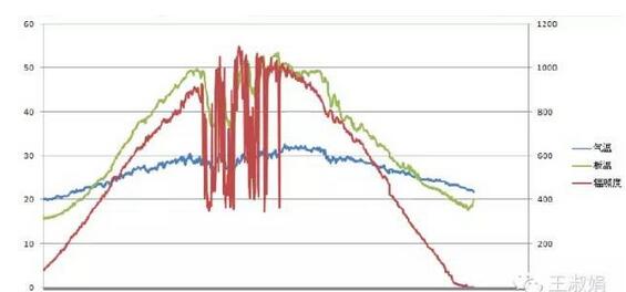 上图中,电池板温度(绿线)最多的时候能比环境温度(蓝线)高出25℃。据文献介绍,在青海正午辐照度最好的时间,电池板温度甚至能比环境温度高出近30℃。