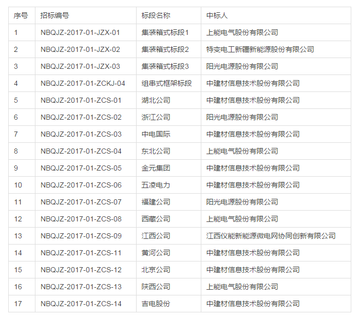 3月21日,国家电力投资集团公司公布了其二〇一七年度第十批集中招标(第一批光伏并网逆变器、组件设备)招标结果公示。结果显示,亿晶光电、天合光能、乐叶光伏、特变电工、阳光电源、上能电气、中节能太阳能、 中电科电子、 光为绿色能源、中建材信息技术、江西仪能新能源等11家企业成功中标,成为2017年光伏行业首批设备供应商。