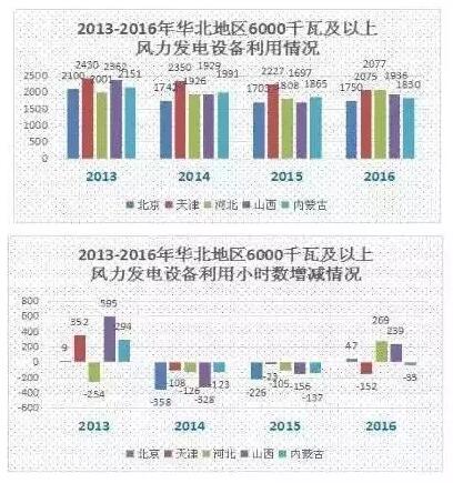 2016年,国家能源局暂缓三北地区新增风电开发建设方案,随着后续一批风电场陆续建设、并网,河北、山西、北京、天津风电设备平均利用小时数有一定上升空间,而内蒙古地区风电还将存在消纳的压力。