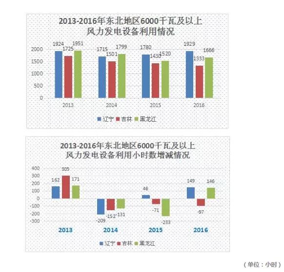 综合数据显示,2016年风电消纳状况明显优于2015年,除吉林外,辽宁、黑龙江风电设备平均利用小时数均有一定幅度的提升,辽宁省风电设备平均利用小时数高达1929小时,高于全国平均水平。