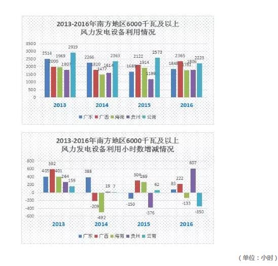 该区域风电设备平均利用小时数总体高于全国平均水平,贵州、广西出现了大幅度的上涨,云南则出现了大幅度下滑。