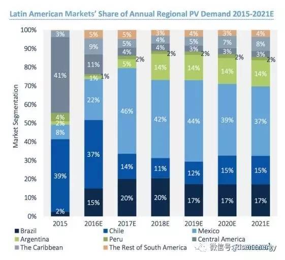 今年,拉丁美洲有望将全球光伏需求占比提高到6.2%,2016年这一数字约为2.4%。报告指出,潜力增长市场主要集中于墨西哥和智利。同时,阿根廷和哥伦比亚等新兴市场正在崛起,而区域巨头巴西则将在低迷中反弹。