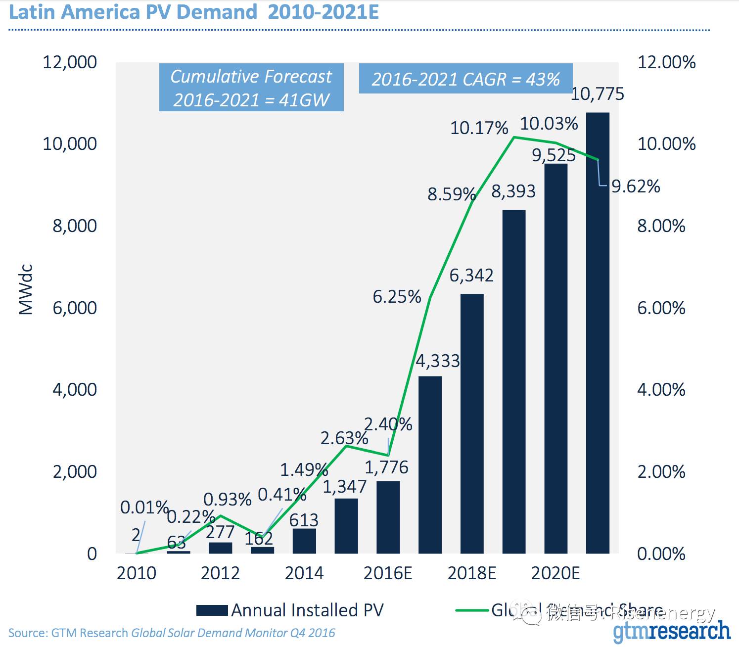 鉴于这些发展,拉丁美洲市场正在指数级增长,2016年~2021年预测将有41GW的光伏需求,年度装机量同比增长一倍以上。到2020年,拉丁美洲将占全球光伏需求的10%。