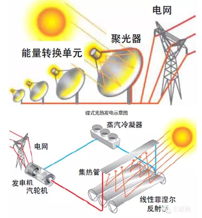 碟式光热系统:利用旋转抛物面反射镜,将入射太阳光聚焦到焦点上,焦点处放置的斯特林发电装置进行发电。