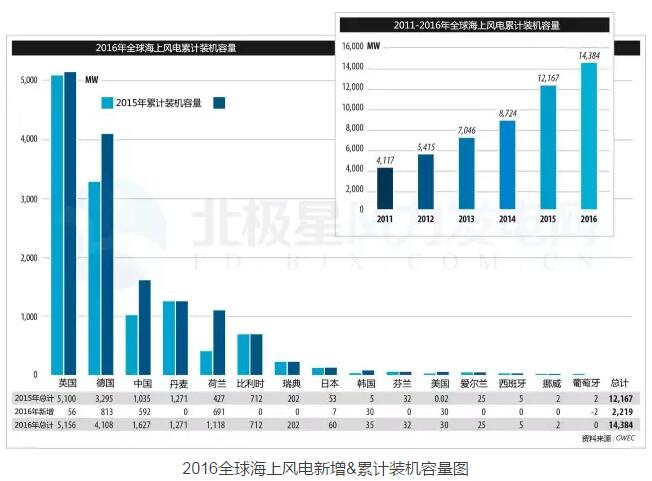 1、2016年全球海上风电增长势头仍然由德国引领,但坐全球海上风电累计装机“头把交椅”的仍然是英国;