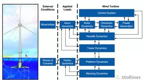 从分析角度讲,浮式风机主要的载荷有:风载、流载、一阶波浪载荷、二阶波浪载荷、叶片覆冰、冰激载荷、重力,分析过程中要考虑空气动力学和水动力学的耦合,比海工浮体分析稍微复杂一点点。
