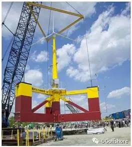 • 2011年Priciple Power在葡萄牙沿岸45m水深位置建成了世界第二个全尺度浮式风机样机:2MW的Wind Float。风机不对称的放在了三个立柱的其中一个上。整体组装,湿拖安装,也体现了半潜基础形式一贯的优点。但是由于结构不对称,当基础产生较大倾斜的时候需要平台安装的压载设备进行调载调平。样机造价2,600万美元。据报道,2016年25MW Wind Float项目获得欧盟批准,预计2019年能够投入运营。