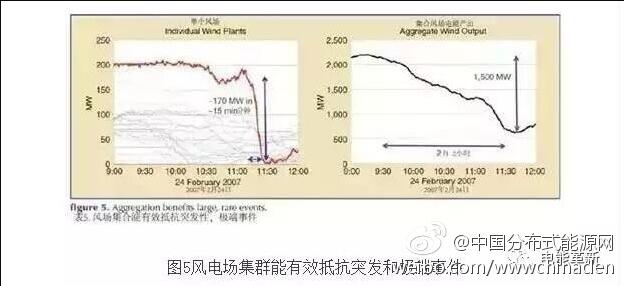 大风暴在4到6小时就可行进几百公里,所以,广阔地理区域的风电集群可以应对这一挑战。在这种情况下,单台风电机组可能从满发突然降到零,而更大地理范围内的集群风电机组就会把这样的突然中断转化为数小时的逐渐下降过程。2007年2月美国德克萨斯州就发生了这样的风暴。图5显示了一个风电场的出力在约15分钟内骤降17万千瓦的过程。