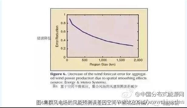 图6显示了风能预测的巨大集群效应。如图所示,750公里以上范围的风电集群预测误差降低了50%。图中显示了误差率已经降至区域预测和单一风电场的标准误差(RMSE)之间,以上数据是基于对德国40个风电场所发电量的测量结果得到的。