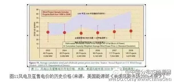 在趸售电价方面,风能也显示出了优势。图11中,带状图形表示2003年到2008年平均趸售电价的最高和最低价格。红点表示1998年到2008年每年(在运行天数中的)风电容量加权后的平均电价。对图中的各项目数据进行累计发现,风电的平均电价与最低趸售电价相当或者更低。