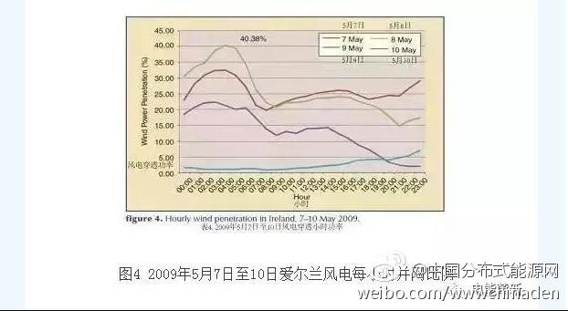 一些国家的电网运营商在积累高比例风电并网及其变化规律的运营经验。图4显示了从2009年5月7日至10日,爱尔兰风电的每小时接入比例,范围从很小的比例到高达40%。