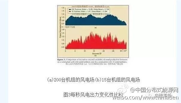单个风电场通常在一年内可能产生超过1000小时的零出力现象,而在广阔地理范围内大规模集群的风电机组的出力几乎总是大于零。同时时间尺度越短,变化幅度也就越小。大规模的风电场,每秒或者每分钟的变量非常小,但是可能在若干小时后会呈现很大变化,即便分布式风电场亦如此。
