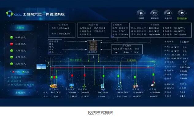 为了确保该系统能够在无任何其他电网的情况下正常启动(黑启动)、独立稳定运行(孤网运行),协鑫智慧能源和有关电力研究单位共同组织了本次测试。在并网运行时,断开市电开关进入孤网运行,孤网运行时负荷从25kW到70kW变化,系统均能稳定运行,实现了以燃气轮机为主电源的黑启动和孤网运行。同时,还测试了从技术、经济、环保和效率四个维度设计的低碳、经济、高效、受限和优化模式,通过输入气价、电价、热能需求等参数调节燃机的出力,系统均能及时响应并稳定运行,“六位一体”微能源系统完成了在黑启动和孤网运行的情况下多能互补微能源系统的全部功能。