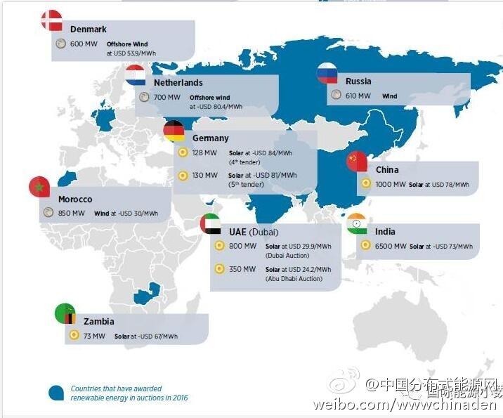 国际可再生能源署(IRENA)日前发布报告,盘点2016年各国风电、光伏的最低报价。