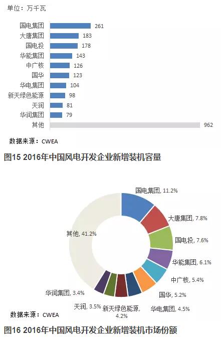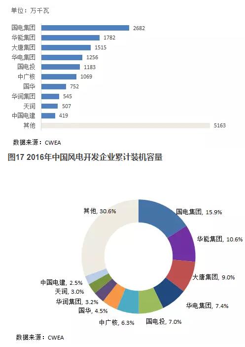 2016年,中国风电有新增装机的开发商企业超过100家,前十家装机容量超过1300万千瓦,占比达到58.8%。累计装机前十家的开发企业装机容量超过1亿千瓦,占比达到69.4%。