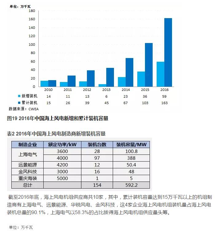 2016年,中国海上风电新增装机154台,容量达到59万千瓦,同比增长64%。共有4家制造企业有新增吊装,其中,上海电气的海上风电机组供应量最大,占比达到82.5%;其次是远景能源、金风科技和重庆海装。