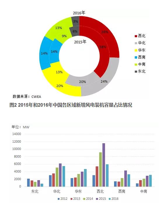 2016年,我国六大区域的风电新增装机容量所占比例分别为西北地区(26%)、华北(24%)、华东(20%)、西南(14%)、中南(13%)、东北(3%)。
