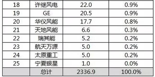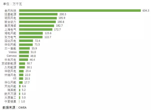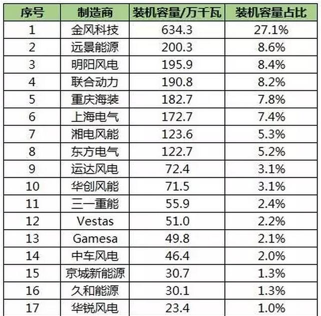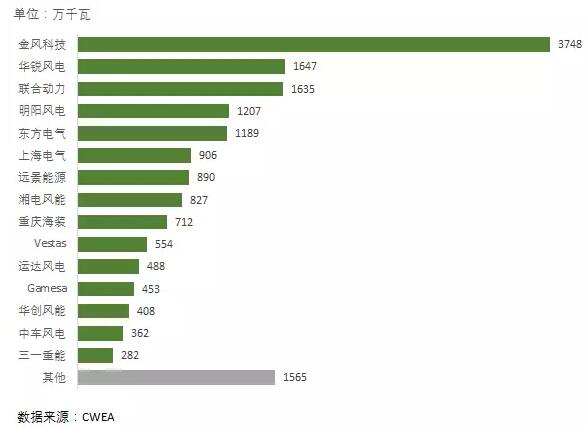 2016年,中国风电有新增装机的整机制造商共25家,新增装机容量2337万千瓦,其中,金风科技新增装机容量达到634.3万千瓦,市场份额达到27.1%。金风科技仍遥遥领先,位列第1。远景能源、明阳风电、联合动力和重庆海装分列2至5名。