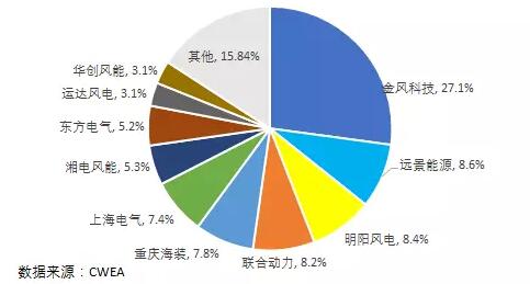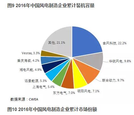 全国累计装机容量1.69亿千瓦,截至2016年底,有五家整机制造企业的累计装机容量超过1000万千瓦,五家市场份额合计达到55.9%;其中金风科技累计装机容量达到3748万千瓦,占国内市场的22.2%。