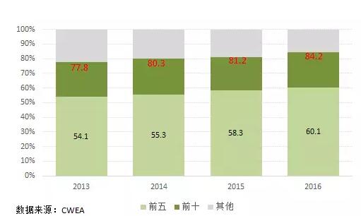 近4年,风电整机制造企业的市场份额逐渐趋于集中。排名前五的风电机组制造企业市场份额由2013年的54.1%增加到2016年的60.1%,排名前十的风电制造企业市场份额由2013年的77.8%增长到2016年的84.2%。
