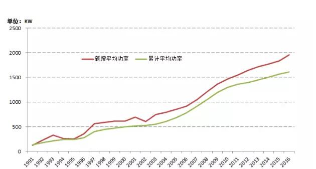 图11 1991年至2016年中国新增和累计装机的风电机组平均功率