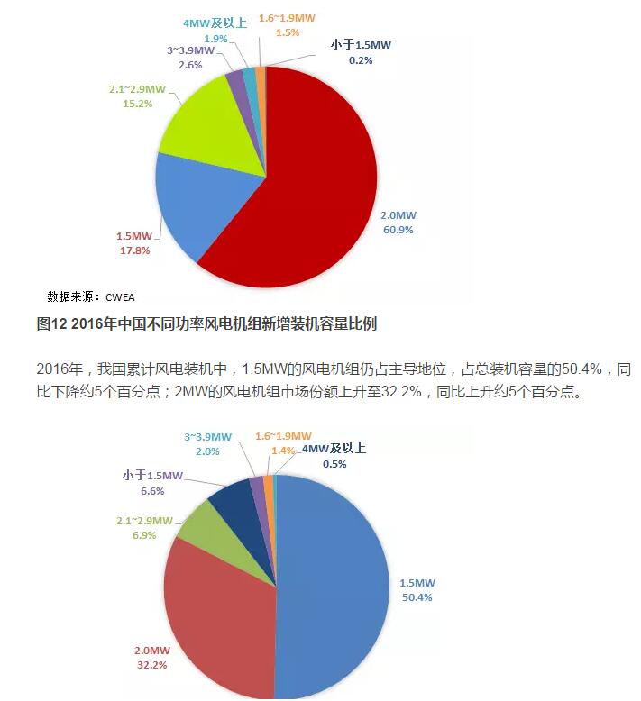 2016年,我国新增风电机组中,2MW风电机组装机占全国新增装机容量的60.9%,与2015年相比,2MW机组所占市场份额上升11个百分点;1.5MW机组市场份额下降了16个百分点至17.8%;1.5MW机组和2.0MW机组合计市场份额达到78.7%。2.1MW至2.9MW机组市场份额达到15.2%,3MW至3.9MW机组(3MW和3.6MW)市场份额达到2.6%,4MW及以上机组(包括4MW、4.2MW、5MW)占比达到1.9%。