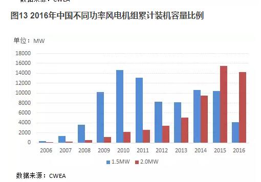 图14 2006年至2016年1.5MW和2.0MW机组新增装机容量