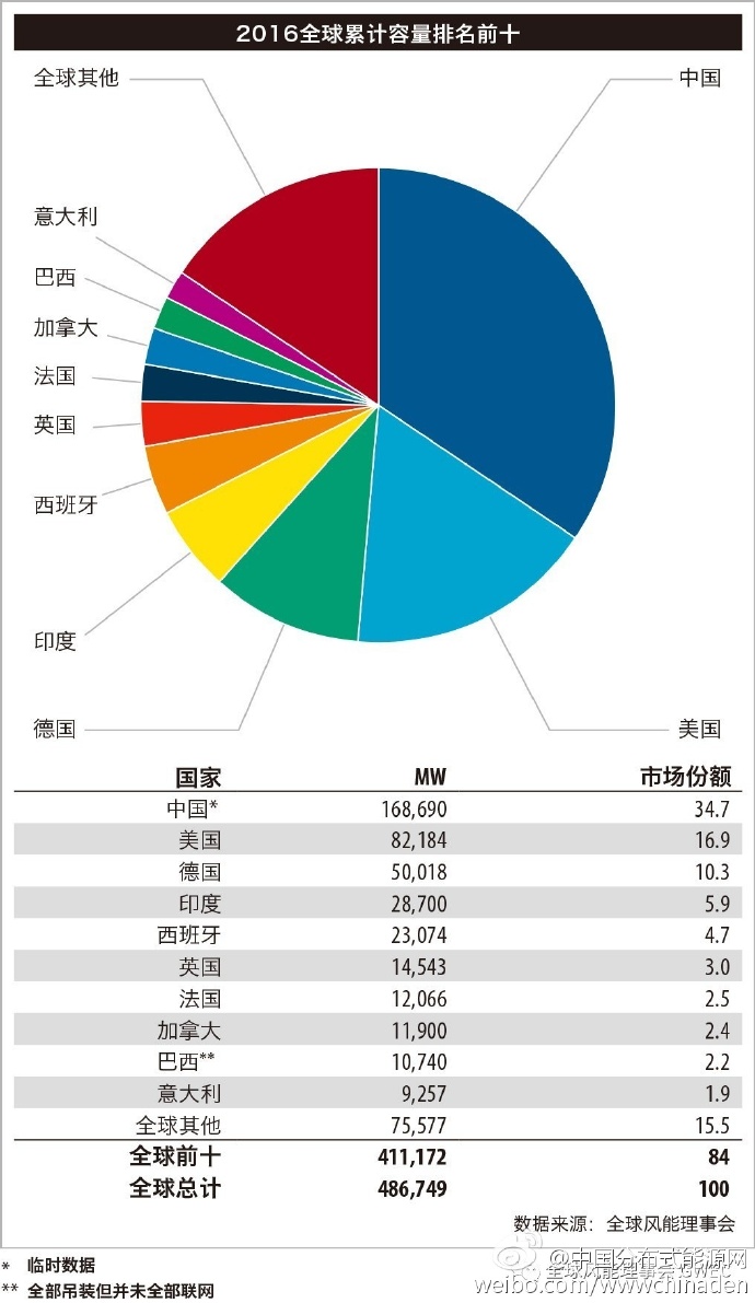 布鲁塞尔,2017年2月10日, 全球风能理事会发布2016年全球风电发展统计数据:2016年全球市场新增容量超过54.6GW, 全球累计容量达到486.7GW。 2016年的风电市场由中国、美国、德国和印度引领, 法国、土耳其和荷兰等国的表现超过预期,尽管在年新增装机上,2016年未能超过创纪录的2015年,但仍然达到了一个相当令人满意的水平。