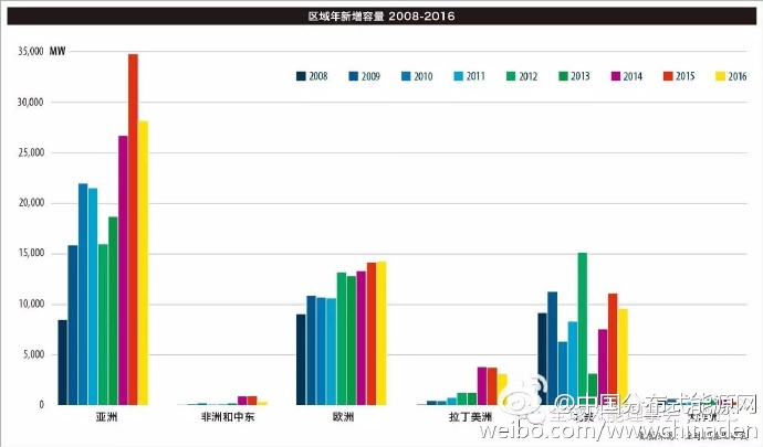 非洲风电发展相对沉寂,仅有418MW新增容量出现在南非。南非的“(国家)可再生能源项目”目前由于国内政治斗争而处于搁浅状态。 其他地区, 摩洛哥成功地进行了招标项目,由超过800MW的项目将在未来几年建成。 肯尼亚Turkana湖项目也接近尾声。埃及的可再生能源发展的计划似乎目前也受到阻碍,前景不明。 大洋洲的发展也相对沉寂,澳大利亚新增装机容量140MW,但是有迹象表明澳大利亚的风电市场将在未来经历强劲复苏。