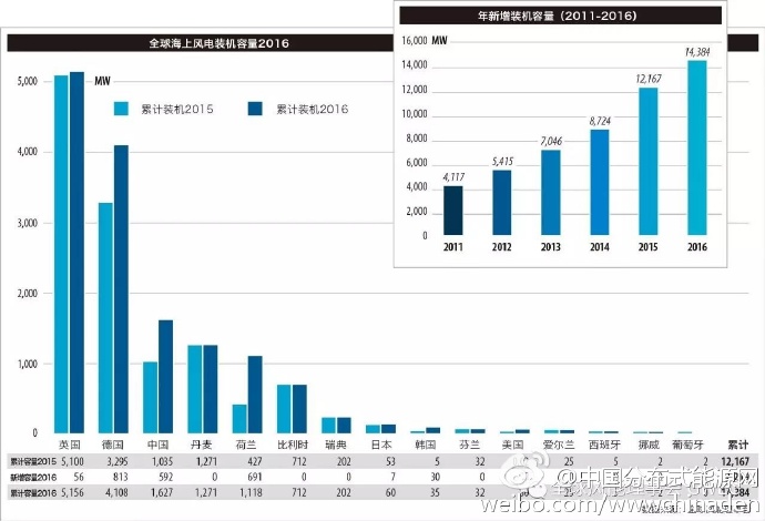 “风电继续以两位数的速度增长, 我们不能期待一个产业的增长每年都创新纪录”,全球风能理事会秘书长Steve Sawyer说,“中国的装机容量有所下降,这主要是由于2015年风电抢装后的回调,此外电力需求下降和电网消纳风电能力不足也是主要原因。 我们期待2017年风电装机继续增长”。中国海上风电装机容量在2016年大幅增加, 超过丹麦排在全球海上风电装机榜单第三位, 紧随英国和德国。